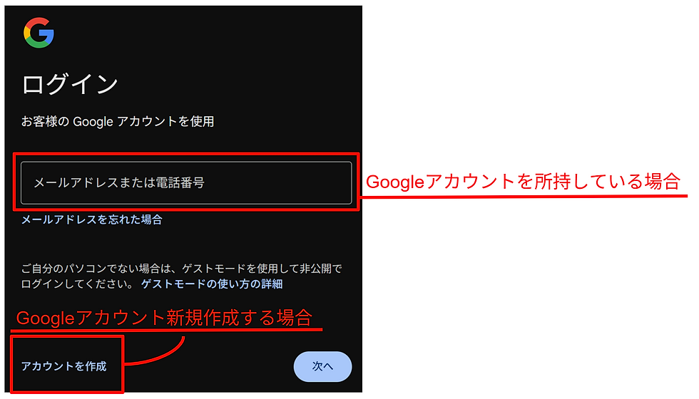 NotebookLMの公式サイトにアクセスし、Googleアカウントを使用してログインします。 (Googleアカウントをお持ちでない方は「アカウントを作成」から指示に従って任意のアカウントを新規作成しましょう。)