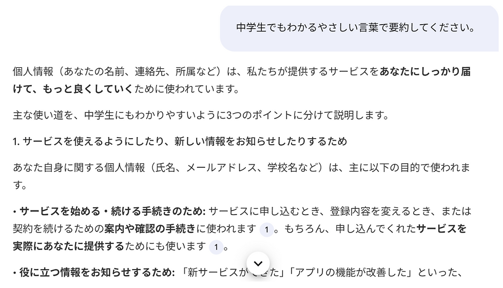 タスク:読むのが面倒なプライバシーポリシーから必要な情報を引き出し、要約します。 例題用PDF:弊社の公開するプライバシーポリシーを例題として使用します。