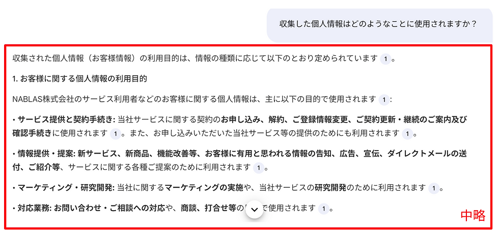 さっそくプライバシーポリシーを確認する際に気になる点をAIに聞いてみましょう。 例えば、「収集した個人情報はどのようなことに使用されますか?」とチャットに入力してみます。 なお、チャット入力部分にソースを基に「よくある質問」がいくつか表示してくれます。効率よく資料を読み解く助けになりますので、ぜひ活用してみてください。